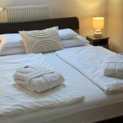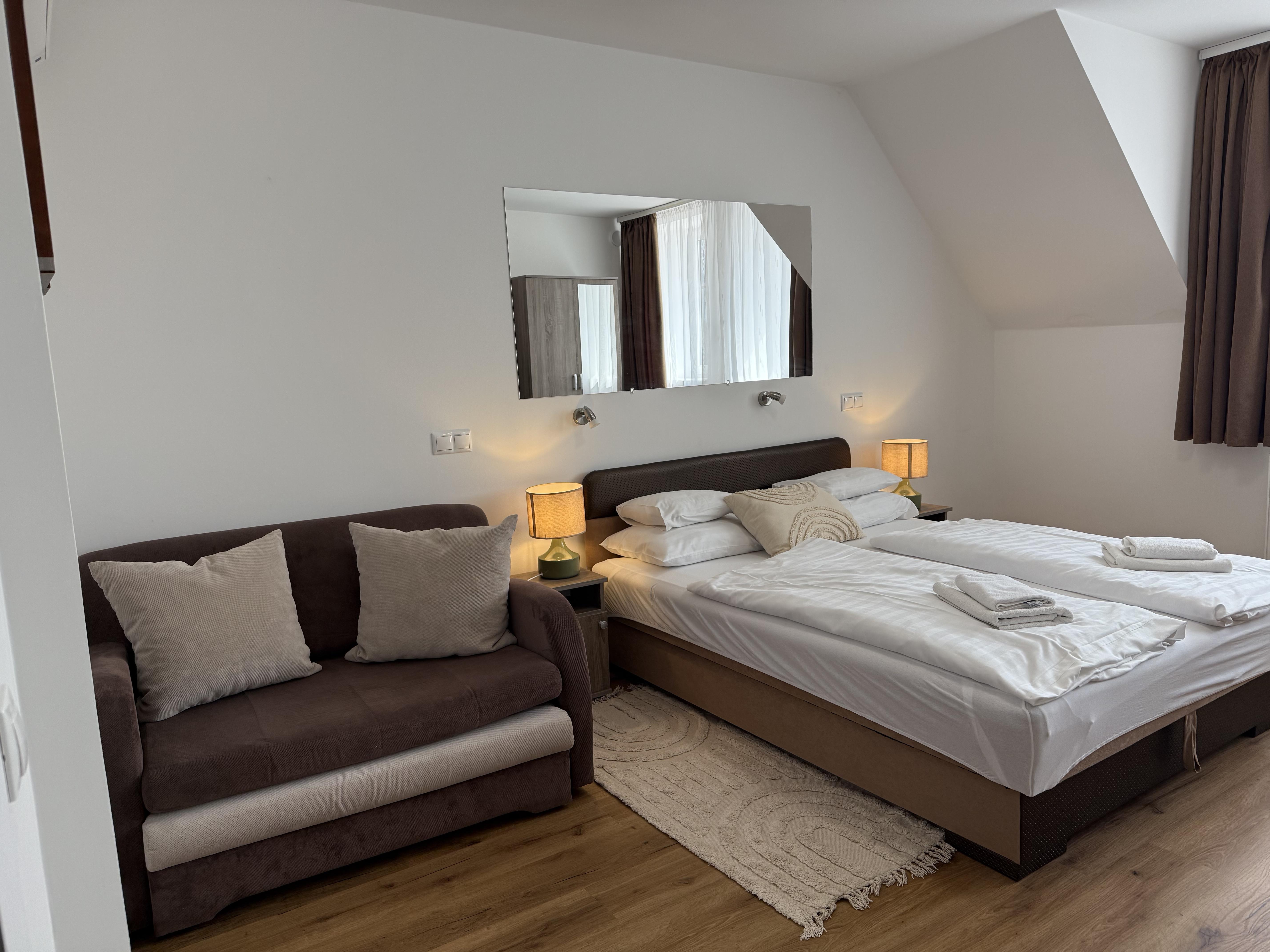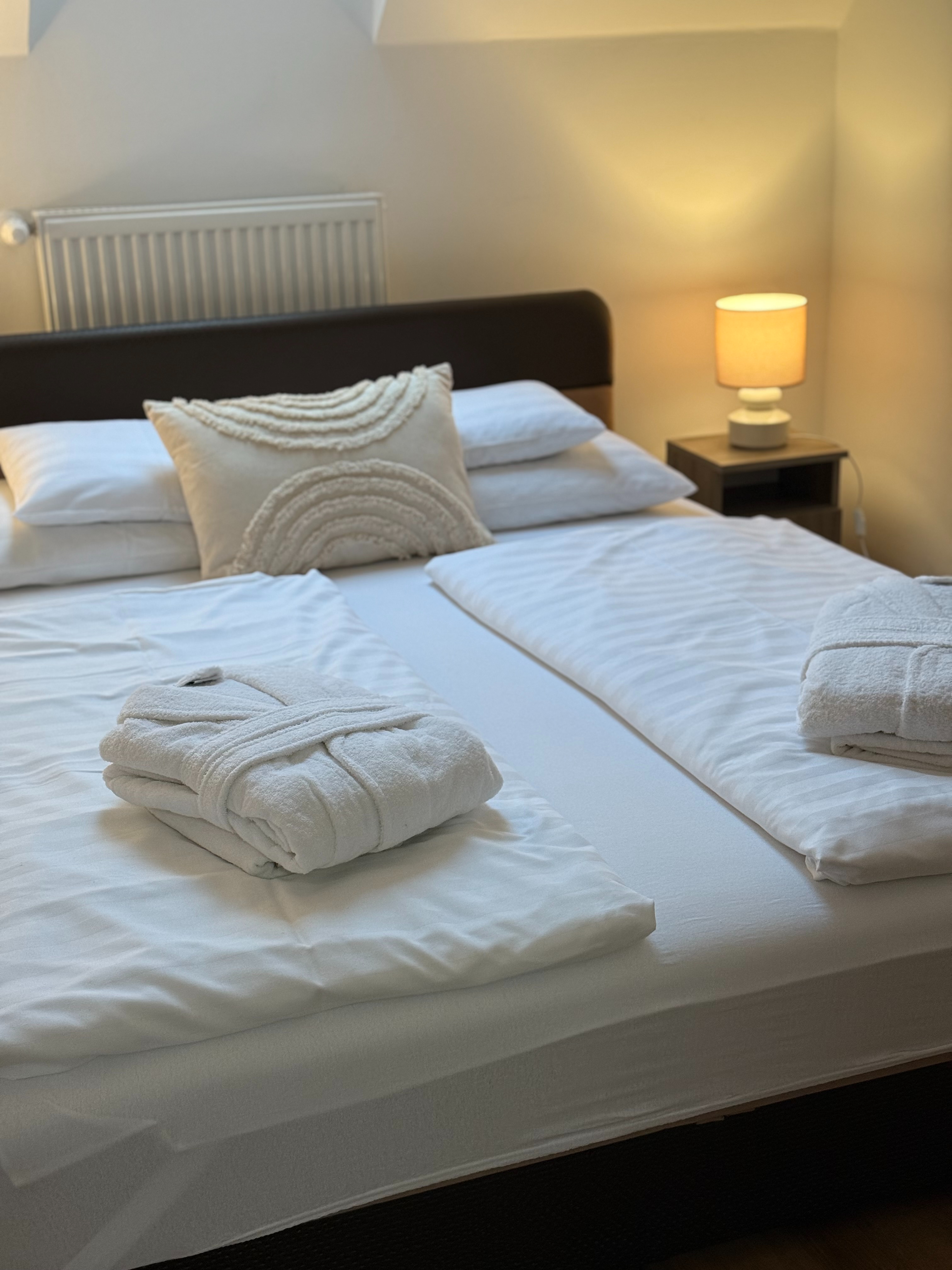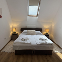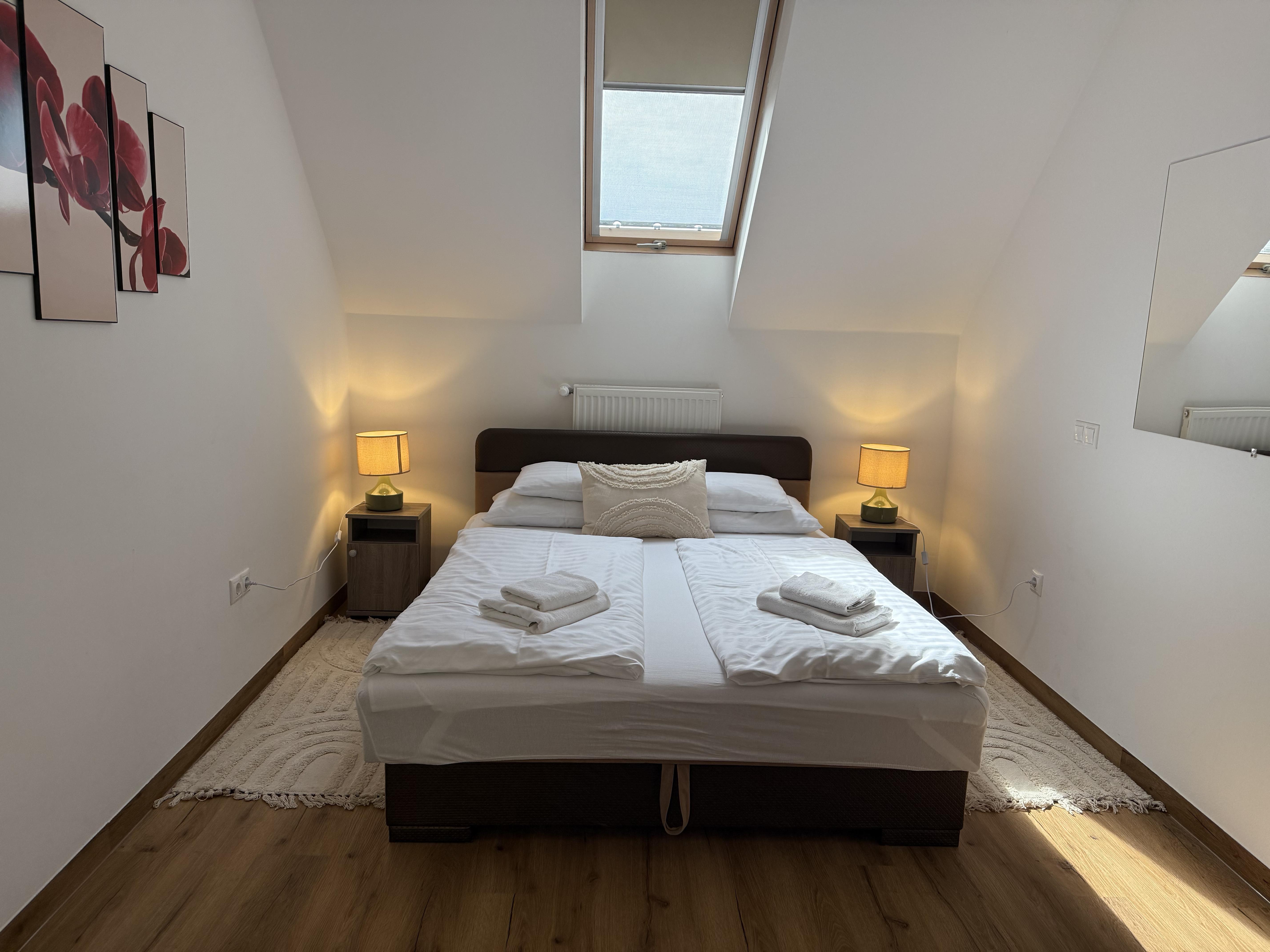 Kompakt, 46 m²-es lakás 2 különálló franciaágyas hálószobával, jól felszerelt konyhával és egy kis terasszal, amely az erdőre néz. A fürdő közelsége miatt akár fürdőköpenyben is lesétálhatunk a termálmedencékhez – mindössze 50 méterre találhatók. Az egyik franciaágyas szobában egy pótágy is található 1 fő részére, így 5 fő számára is ideális választás.